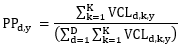 Con base en la información obtenida en el numeral 1 anterior, se calculará la participación porcentual para cada año precio al año (y) de remuneración del PEP del proyecto, de las ventas de cada agente d de combustibles de tipo k en el total de las ventas, así: