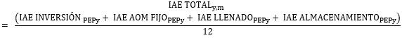| Valor resultante de dividir entre 12, la suma de los valores de IAE INVERSIÓN, IAE AOM FIJO, IAE LLENADO e IAE INVENTARIO, actualizados de acuerdo con lo establecido en los numerales 4.3.1 y 4.3.2, 4.3.4 y 4.3.5 siguientes, para el año (y) de ejecución del PEP, todos estos oficializados por la CREG de acuerdo con lo establecido en el artículo 16 de la presente resolución. Valor expresado en pesos colombianos. En caso de que así lo haya solicitado el ejecutor del proyecto PERP/PC, durante la aplicación de lo establecido en el numeral (i) del literal b) del artículo 12 de la presente resolución, el ingreso mensual IMT a pagar al adjudicatario o al incumbente que ejecute en primera instancia un proyecto, se obtiene mensualizando, al dividir entre doce (12), el valor del IAE INVERSIÓN presentado en la oferta para el respectivo año de ejecución del PEP. |