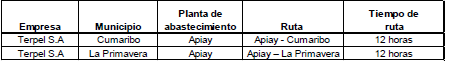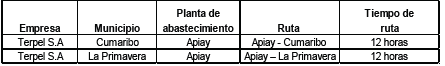 Que, mediante Resolución número 124112 del 23 de abril de 2007, se aprobó el plan de abastecimiento para la distribución de combustibles producidos en el país, en los municipios fronterizos del departamento de Vichada en la cual se establece que, según el sistema nacional de poliductos del país, la fuente de abastecimiento del departamento de Vichada es desde la planta de abasto Mansilla y desde allí hasta la Planta de Puerto Carreño (Vichada), arrendada a la Organización Terpel S. A. No obstante, en esta misma resolución se definió que “el abastecimiento para el municipio de La Primavera se realizará solo desde la planta de abasto de Aguazul, Casanare, de propiedad de la Organización Terpel S. A”.