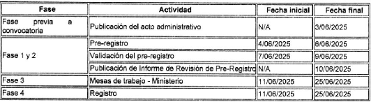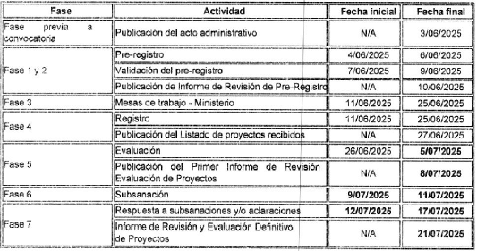 ARTÍCULO 3o. Con fines informativos y de trazabilidad administrativa, se incorpora a la presente resolución un cronograma actualizado del proceso de la convocatoria PRONE No. 001-2025, en el que se refleja la modificación de fechas derivada de lo dispuesto en el artículo 1 de este acto. Dicho cronograma no sustituye los términos jurídicamente vinculantes definidos en el Anexo Técnico adoptado mediante Resolución No. 40243 del 3 de junio de 2025, sin embargo sustituye el cronograma incorporado en la resolución 40300 del 1 de julio de 2025.