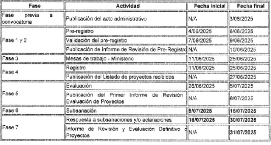 Que el Anexo Técnico estableció en su numeral 4.5 al 4.7 los plazos para la presentación, evaluación, subsanación, revisión y publicación de resultados definitivos de la Convocatoria PRONE 001 del año 2025, el cual inicialmente fue definido de la siguiente manera: