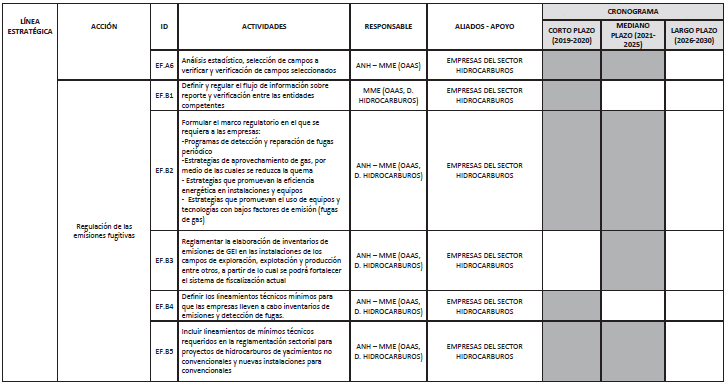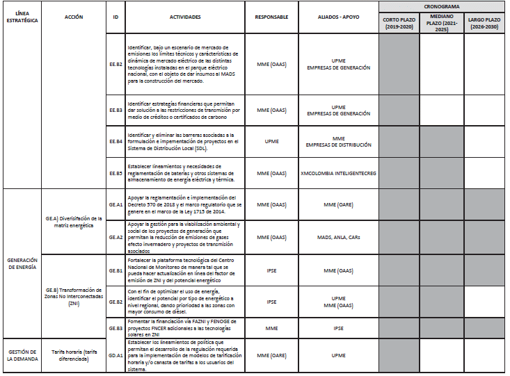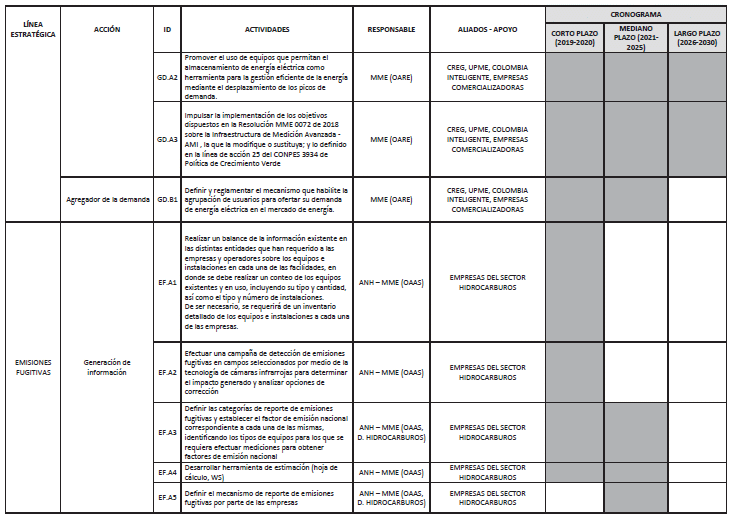 Por otro lado, el componente de mitigación tiene como principal objetivo la reducción de emisiones de GEI. En este sentido, los documentos consultados evidencian una necesidad primordial de generar una reconversión tecnológica de equipos, procesos más eficientes energéticamente, transformación de las zonas no ¡nterconectadas, diversificación de la matriz energética, modelos de tarificación horaria y gestión de las emisiones fugitivas del sector de hidrocarburos. Esto es abordado por las diferentes líneas estratégicas del componente: i) Eficiencia energética, ii) Generación de energía, ¡ii) Gestión de la demanda y iv) Emisiones fugitivas, las cuales cuentan con diferentes acciones para poder generar un marco normativo, de gestión y de planeación que permita el cumplimiento de estos objetivos y construcción de capacidades.