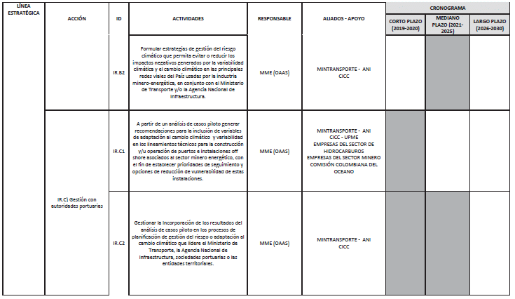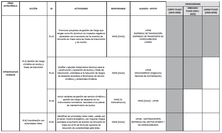 El componente de adaptación, busca atender dos principales impactos negativos generados por los riesgos climáticos sobre la industria: Afectación a la producción minero energética y aumento de conflictividad por afectación a los territorios. Estos impactos se gestionarán a través de las siguientes líneas estratégicas: i) Infraestructura resiliente; en la que se incorpora la gestión del riesgo de desastres, ii) Planeación de corto y largo plazo; por la cual se pretende fortalecer la planeación y funcionamiento del sector iii) Gestión del entorno; que busca atender los impactos indirectos que se generan por la afectación sobre los territorios y iv) Información para la adaptación; mediante la cual se busca disminuir las incertidumbres inherente a los procesos de adaptación.