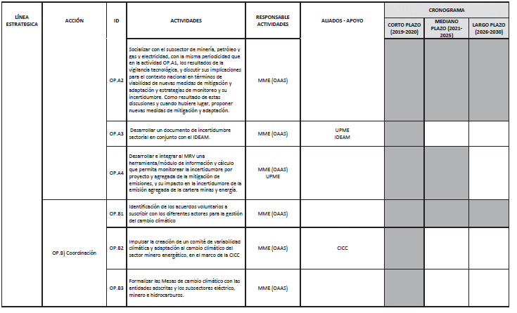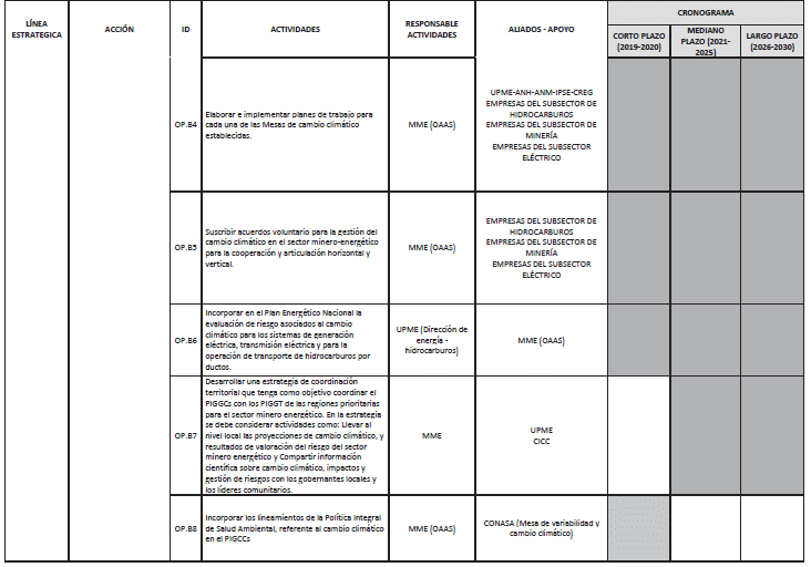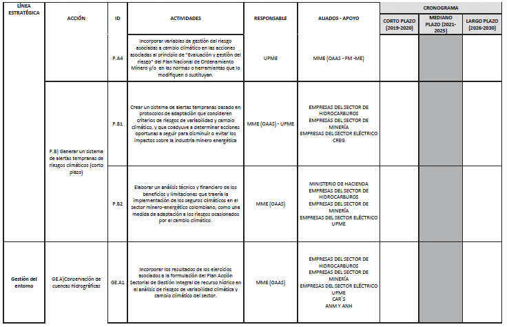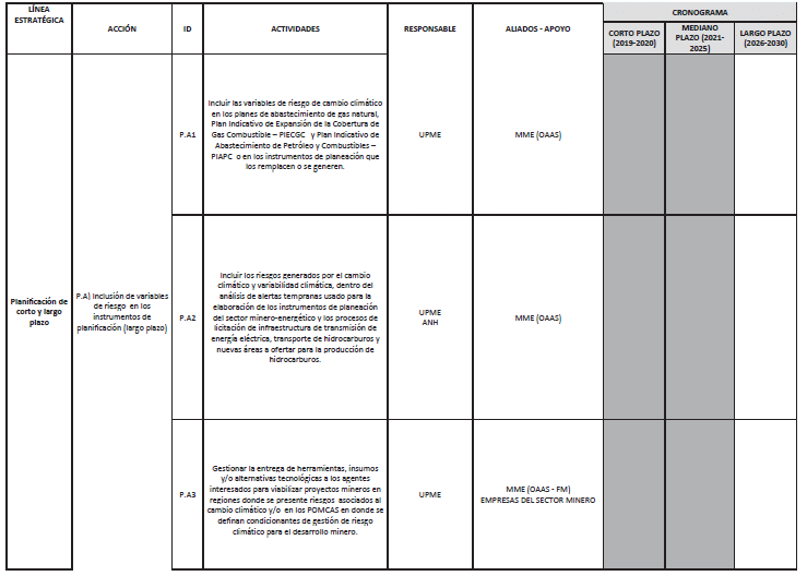 Lo anterior se realiza a través de una planeación sectorial que contempla las condiciones climáticas cambiantes y la coordinación con el territorio donde se realizarán las acciones, convirtiéndose así en una herramienta de apoyo para el Ministerio de Minas y Energía en la búsqueda de fortalecer integralmente las capacidades institucionales, técnicas, de gestión y conocimiento del Sector para enfrentar tempranamente los compromisos y riesgos derivados del cambio climático, convirtiéndolos en una oportunidad para la innovación y la mejora de la competitividad sectorial.