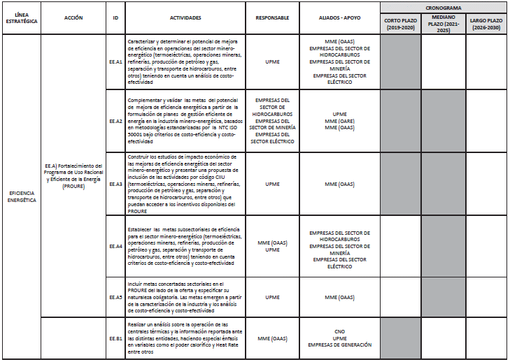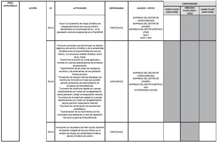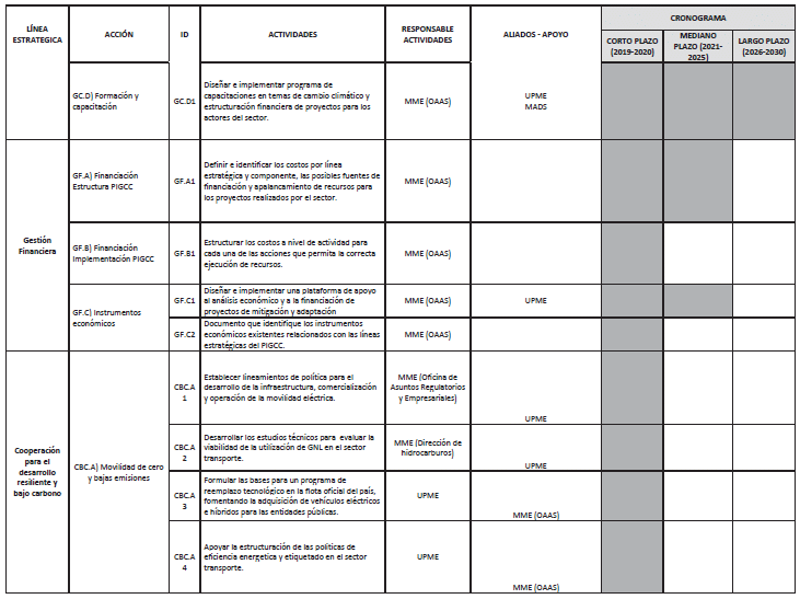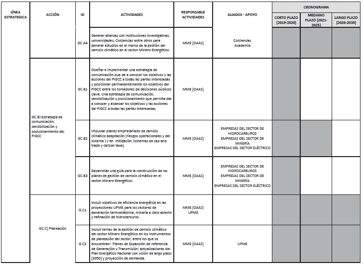 De esta manera el PIGCCm-e, se constituye como un Instrumento a través del cual el Ministerio de Minas y Energía (MME) identifica, evalúa y orienta la Incorporación de estrategias de mitigación de gases de efecto invernadero (GEI) y de adaptación al cambio climático en la planeación sectorial, respaldando y dando soporte a sus políticas y regulaciones, en un horizonte de planeación de 12 años.
