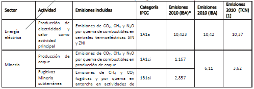 Posterior al primer IBA de Colombia presentado en diciembre de 2015, el IDEAM publicó en septiembre de 2017 la Tercera Comunicación Nacional (TCN) del País, en la cual se presentaron las emisiones de GEI del país anuales de 1990 a 2012. En estos resultados de la TCN, el INGEI de 2010 contempló cifras de emisiones actualizadas para el sector minas y energía. El detalle de las emisiones asignadas al MME para 2010 corresponde a las señaladas en la Tabla 3.