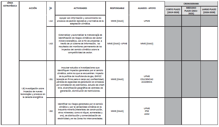Con esta acción se busca consolidar la información clave para el entendimiento detallado de los efectos del cambio climático en el sector a través, del fortalecimiento de la UPME en temas de l+D+i (Investigación, desarrollo e Innovación). Para el desarrollo de estudios e investigación en temas de resiliencia y reducción de emisiones de GEI. Además, establecer una agenda de investigación aplicada al sector energético que esté enfocada en la mitigación de GEI y adaptación al cambio climático; para lo cual se deberá conformar un banco de proyectos en temas de generación energética, eficiencia energética, gestión de la demanda, emisiones fugitivas y riesgo climático, que permita realizar una estructuración y financiación de proyectos.