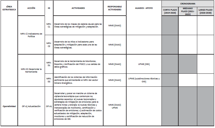 El MME con base en las metodologías que hacen parte de los parámetros internacionales de Monitoreo, Reporte y Verificación desarrolladas por World Resources Institute (WRI), desarrollará los indicadores apropiados para evaluar la Implementación de las políticas y estimar los efectos logrados que se producirán como resultado de las acciones promovidas por el MME en el PIGCCm e para los componentes de mitigación y adaptación.