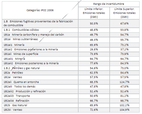 Por lo tanto, las emisiones del sector minas y energía tienen asociada una incertidumbre. El IDEAM reportó dicho rango de incertidumbre en el documento de la TCN y en las tablas a continuación se presenta los valores reportados.