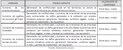 5. La amenaza se define como un peligro latente de que un evento físico de origen natural, o causado por la acción humana de manera accidental, se presente con una severidad suficiente para causar pérdida de vidas, lesiones u otros impactos en la salud, o también daños y pérdidas en los bienes, la infraestructura, los medios de sustento, la prestación de servicios y los recursos ambientales. En el marco de la adaptación al cambio climático, las amenazas corresponden a los eventos climáticos que incluyen: cambio climático, variabilidad climática y eventos climáticos extremos (DNP & MADS, 2012)