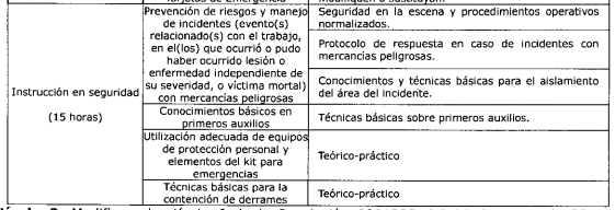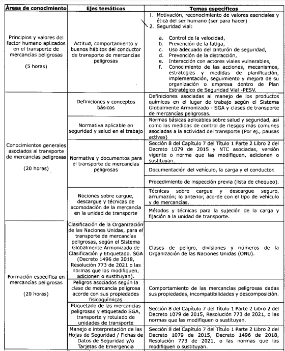 ARTÍCULO 5o. CONTENIDO E INTENSIDAD HORARIA DEL CURSO BÁSICO OBLIGATORIO DE CAPACITACIÓN PARA CONDUCTORES QUE TRANSPORTAN MERCANCÍAS PELIGROSAS. <Artículo modificado por el artículo 1 de la Resolución 20243040051775 de 2024. Rige a partir del 2 de junio de 2025, consultar en Legislación Anterior el texto vigente hasta esta fecha. El nuevo texto es el siguiente:> El curso básico obligatorio de capacitación para conductores que transportan mercancías peligrosas, podrá ser desarrollado de manera presencial o bajo la metodología a distancia y con estrategia de educación virtual, en la proporción porcentual determinada en la Resolución número 15177 de 2022 del Ministerio de Educación, o aquella que la modifique, adicione o sustituya y contemplará, como mínimo, las áreas de conocimiento, ejes temáticos, temas específicos e intensidad horaria, que se determina en la siguiente tabla: