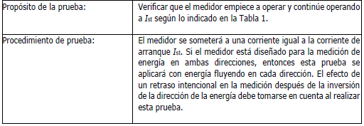 La prueba se realiza a Ist y al factor de unidad de potencia. Para la verificación inicial de los medidores producidos de un proceso de operación continua que resulte en un número grande de unidades idénticas, es suficiente registrar la curva de error de Ist a Imin en un conjunto de prueba cada 3 meses para el tipo de medidor relevante. Para la verificación inicial de los medidores producidos por otros medios, será suficiente si se observa el medidor operar continuamente cuando se aplica la corriente inicial (refiérase al procedimiento de prueba en 10.7.2.3). Un medidor con más de un modo de conexión debe ser probado en todos los modos. No obstante, si la prueba se realiza in situ sobre un medidor instalado, solo el modo de conexión actual debe ser probado.