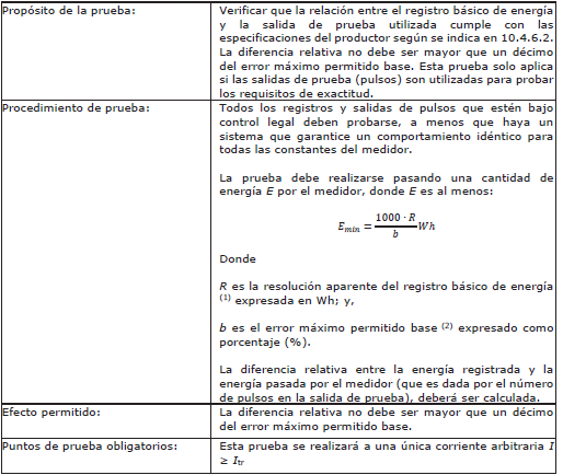 Si las salidas (pulsos) de prueba son utilizadas para las pruebas de requisitos de exactitud, se debe realizar una prueba para garantizar que la relación entre el registro de energía básico y la salida de prueba relevante cumple con las indicaciones del fabricante. La prueba debe realizarse pasando una cantidad de energía E por el medidor, donde E