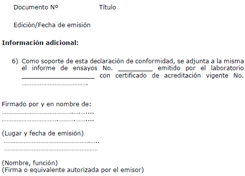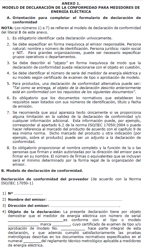 Con este requisito, el productor o importador proporciona una declaración de que el medidor de energía eléctrica está en conformidad con los requisitos especificados en el presente Reglamento Técnico Metrológico y construido con los mismos criterios del modelo aprobado. Esta declaración debe ser expedida de conformidad con los requisitos establecidos en la norma internacional ISO/IEC 17050:2004, utilizando el modelo de declaración de conformidad incluido en el Anexo, además debe ir acompañada del informe de resultados de los ensayos que se señalan en el numeral 10.10.3.1 de este documento.