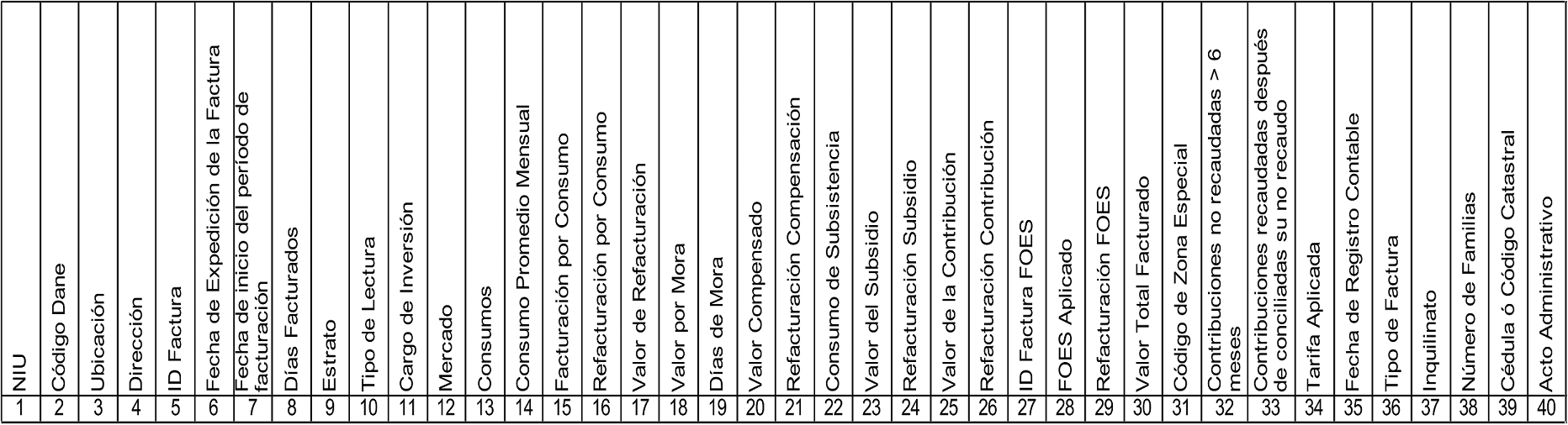 40. Valor del Subsidio: Corresponde al valor facturado en pesos de subsidios aplicados en la factura, a los usuarios no residenciales que eventualmente se vean beneficiados por este y para los usuarios clasificados en el campo 9 como Distritos de Riego (DR). Este valor se deberá reportar positivo sin decimales.