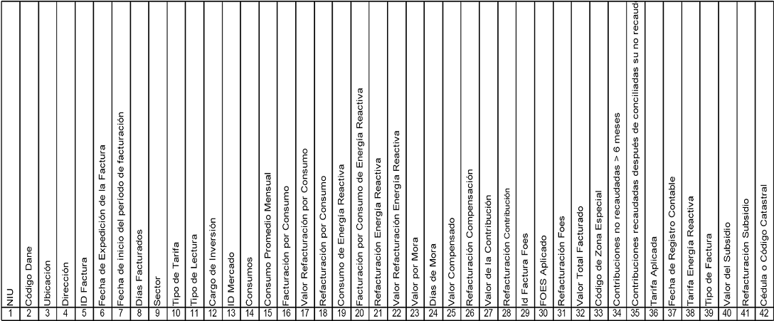 29. ID Factura FOES: Corresponde a los números de identificación de las facturas de referencia, de donde se tomaron los valores de consumo que sirvieron de base para la liquidación del valor del aporte otorgado por el Fondo de Energía Social (FOES).