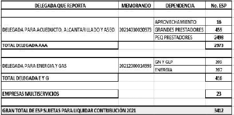 Que el número de prestadores que servirá de base para realizar el cálculo de la tarifa de la contribución especial y para liquidar la contribución adicional destinada al fortalecimiento del Fondo Empresarial en la vigencia 2021, fue el obtenido de la información obrante en el RUPS al 31 de diciembre de 2020, conforme con la verificación realizada por las Superintendencias Delegadas para Acueducto, Alcantarillado y Aseo y para Energía y Gas Combustible de la Superservicios, remitida mediante los memorandos relacionados a continuación: