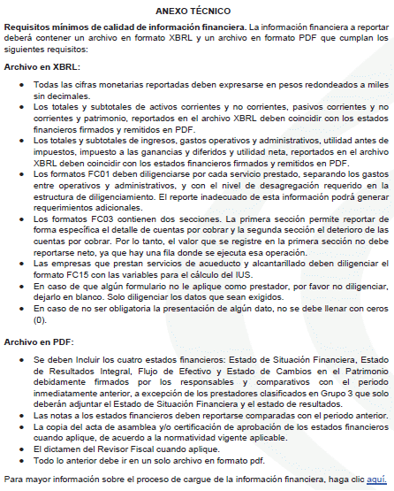 PARÁGRAFO. El diligenciamiento del Formato Complementario [900040] FC15- Información sobre el cálculo del IUS - Indicador Único Sectorial establecido y disponible en las taxonomías para el reporte de la información financiera], es obligatorio para los prestadores de los servicios públicos domiciliarios de acueducto y/o alcantarillado, sujetos al cumplimiento de la Resolución CRA 906 de 20194 de Regulación de Agua Potable y Saneamiento Básico (CRA). Los valores reportados deberán ser determinados con base en la regulación expedida por la CRA.