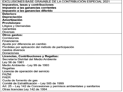 Que no formarán parte de la base gravable de la contribución especial 2021 los siguientes conceptos incluidos en el Formato Complementario [900017] FC01-01 a FC01-07 “Gastos de Servicios Públicos”, de 2020: