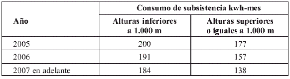ARTÍCULO 1o. CONSUMO DE SUBSISTENCIA PARA BARRIOS SUBNORMALES. Se establece el consumo de subsistencia para este tipo de usuarios en 184 kWh-mes para alturas inferiores a 1000 metros sobre el nivel del mar y en 138 kWh-mes para alturas iguales o superiores a 1000 metros sobre el nivel del mar.