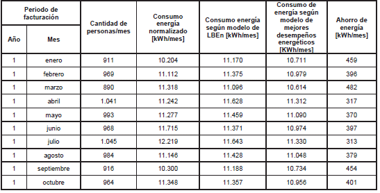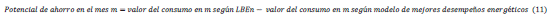 Los potenciales de ahorro considerando las condiciones habituales de operación de la edificación, se estiman al calcular la diferencia entre los valores de consumo de la LBEn y los valores del consumo de energía según el modelo de mejores desempeños energéticos de acuerdo con el valor de la variable relevante