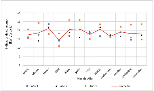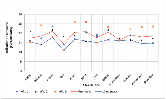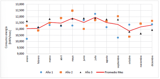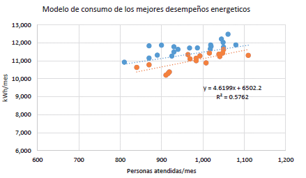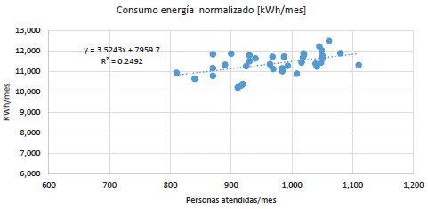 Con la ayuda de Excel es posible graficar la línea base energética a partir de un gráfico de correlación donde los valores de Y corresponde a los consumos mensuales de energía, y los valores de X corresponde a la cantidad de personas atendidas por mes.