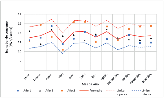 Repitiendo la metodología del modelo de valor absoluto, la línea base, determinada como el promedio de los valores de cada mes, y sus límites superior e inferior se ve de la siguiente manera: