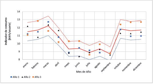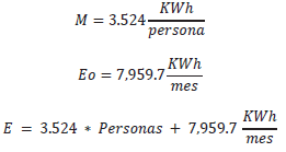 La energía asociada al consumo se estima para cada mes utilizando la ecuación de la LBEn, resultando en el término ![]()