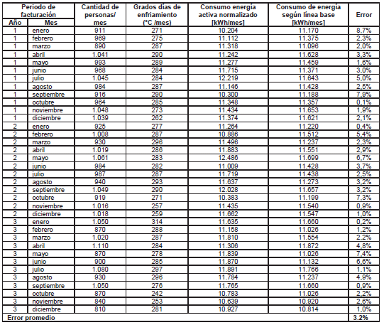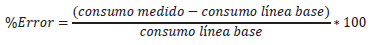 Como se observa, el error de cada observación solo sobrepasa el 5% en 4 datos, y el valor del error promedio es de 3.2%, lo que significa que el modelo de línea base utilizado estima de manera confiable el consumo de energía para el ejemplo dado.