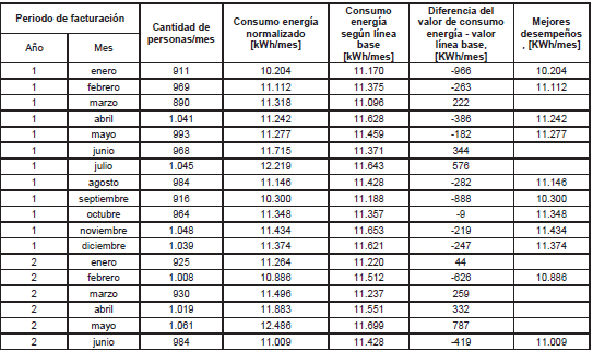 | Año | Mes | Cantidad de personas/mes | Grados días de enfriamiento (°C /mes) | Consumo energía activa normalizado [kWh/mes] |