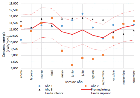 Debido a que existe una variable significativa a los cambios del consumo de energía mes, se plantea un modelo de regresión de una variable que caracteriza el consumo del periodo base seleccionado y que constituye la línea base o consumo de referencia mensual de la edificación.