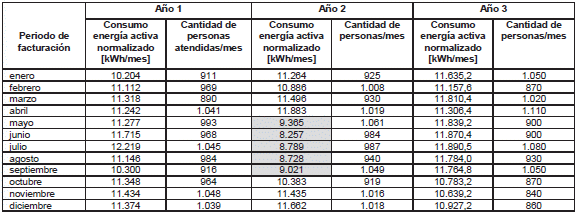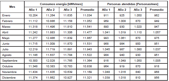 En la siguiente tabla se muestran los valores de los consumos de energía y de personas atendidas por mes, así como sus promedios.