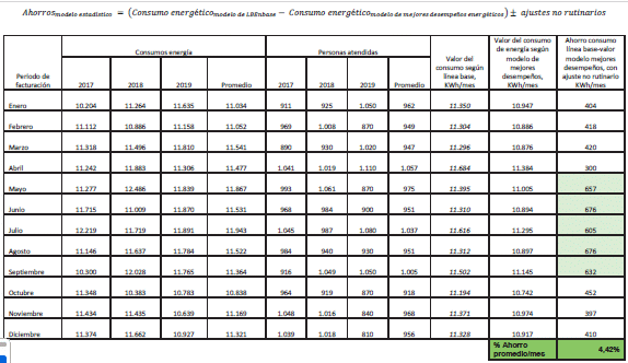 Finalmente, se calcula el ahorro ajustado con el consumo de energía del con el modelo de LBEn y el modelo de línea meta, aplicando el ajuste a los meses respectivos.