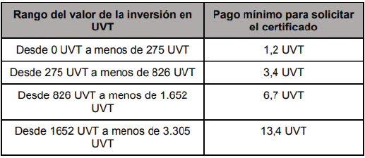 1. Para los proyectos con un valor de inversión entre cero (0) UVT y menos de tres mil trescientos cinco (3.305) UVT, el pago mínimo para solicitar el certificado debe ser el que le corresponda de acuerdo con los siguientes rangos: