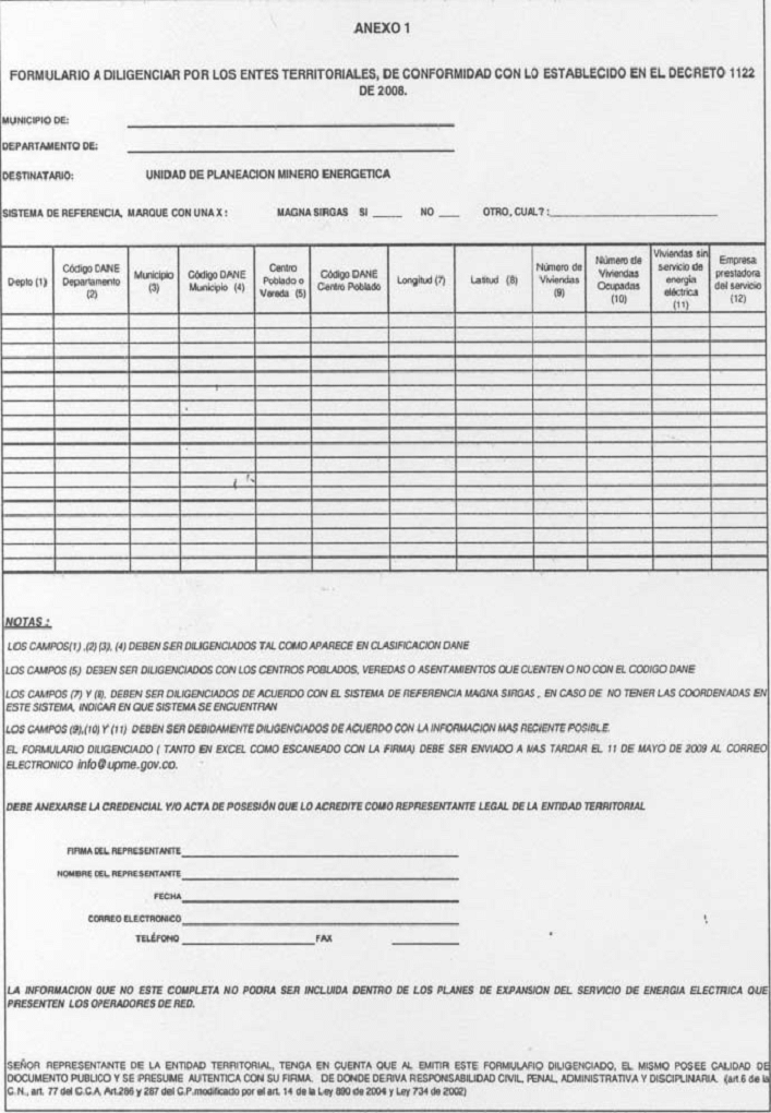 En cumplimiento de lo anterior la UPME expidió la Resolución número 0166 de 2009, con la cual se establecieron las condiciones y plazos de presentación de los requerimientos de cobertura del servicio de electricidad que los Entes Territoriales deben reportar a la UPME y se adoptó el formato de recolección de la información.