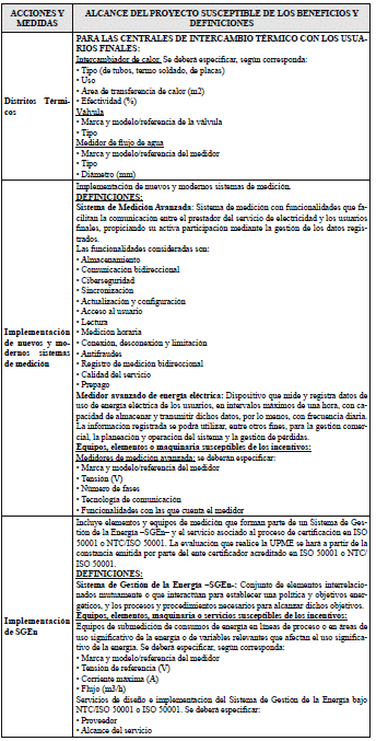 ARTÍCULO 3o. ALCANCE DE LOS PROYECTOS SUSCEPTIBLES DE LOS BENEFICIOS. <Resolución derogada por el artículo 12 de la Resolución 196 de 2020> Los proyectos de eficiencia energética o gestión eficiente de la energía susceptibles de los beneficios tributarios, siempre deberán presentarse ante la UPME en el marco de las acciones y medidas definidas en las Resoluciones MME-MADS-MHCP 1988 de 2017 y MME-MADS-MHCP 0367 de 2018, según se describe a continuación: