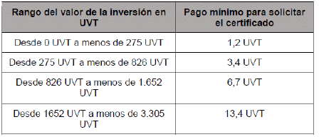 1. Para los proyectos con un valor de inversión entre cero (0) UVT y menos de tres mil trescientos cinco (3.305) UVT, el pago mínimo para solicitar el certificado debe ser el que le corresponda de acuerdo con los siguientes rangos: