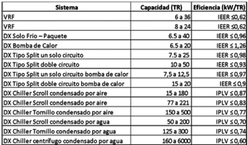 | Climatización | Adquisición de sistemas de aire acondicionado eficientes Aislamientos térmicos (Cuartos fríos/Distribución de frío por ducto de aire/Distribución del frío por tubería de agua helada). Incluye aislamiento térmico de tipo industrial utilizado en sistemas de aire acondicionado y refrigeración con el propósito de disminuir las pérdidas de frío o calor. Se deberán especificar: - Marca y modelo/referencia del aislamiento. Aires acondicionados con refrigerante con GWP menor a 100. Incluye sistemas unitarios, para recintos y unidades terminales compactas de las clases A y B dadas por el RETIQ (hasta 36.000 BTU); sistemas VRF (Variable Refrigerant Flow) enfriados por agua de acuerdo con el EER (Energy Efficiency Ratio); sistemas de expansión directa y VRF enfriados por aire de acuerdo al IEER (Integrated Energy Efficiency Ratio); enfriadoras con eficiencias basadas en el IPLV (Integrated Part Load Value) y medidas en kW/TR o BTU/W, Sistemas Autocontenidos con menor GWP, Unidades condensadoras con menor GWP, Sistemas centralizados con menor GWP. La tabla descrita a continuación muestra los valores de referencia exigidos bajo condiciones de operación AHRI (Air-Conditioning, Heating, and Refrigeration Institute). Se tendrá en cuenta, de igual manera, la eficiencia demostrada por los equipos bajo condiciones reales de operación, tomando como referencia el ASHRAE Temperature Bin Methode en su versión más reciente o información climática de otro organismo reconocido internacionalmente. Los equipos deberán tener certificación AHRI que respalde sus eficiencias o certificación equivalente. ![]() Se deberá especificar: - Marca y modelo/referencia del equipo. En el documento técnico se debe especificar: - Tipo de compresor (hermético, semihermético, scroll, tornillo, centrífugo). - Sistema de enfriamiento (por aire, por agua). - Potencia frigorífica del equipo de refrigeración (kWt, TR o BTU/h). - Eficiencia (rango de clasificación RETIQ, EER (Energy Efficiency Ratio), IEER (Integrated Energy Eficiency Ratio) o IPVL (Integrated Part Load Value)). Sistemas centralizados con GWP menor a 100 Se deberá especificar: - Marca y modelo/referenci |
